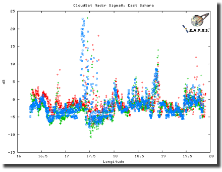 CloudSat repeat data over the Eastern Sahara, displaying variation due to cross-track drift and a small data anomaly.